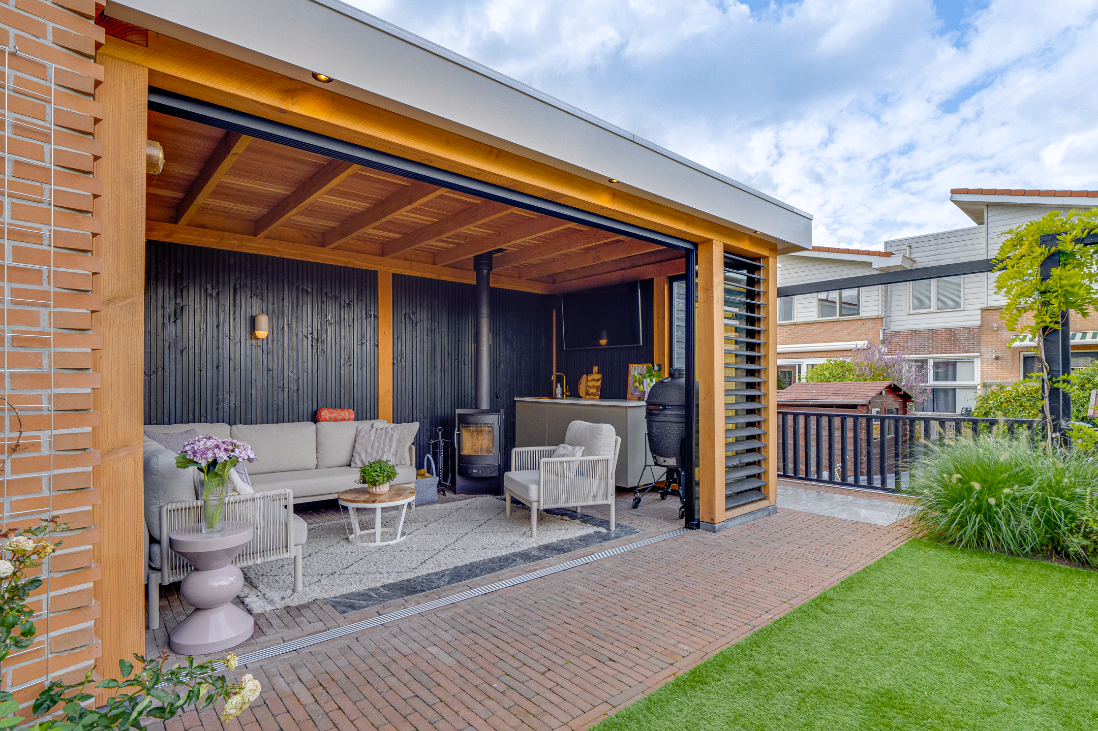 Voor dit project is gekozen voor een strak vormgegeven buitenverblijf dat direct aan de woning is geplaatst. De overkapping vormt één geheel met de schuur, waarbij het open gedeelte is voorzien van een glazen schuifwand, shutters en een steellook glaswand. Doordat de schuur terugliggend is geplaatst, ontstaat er extra openheid en een prettige lichtinval in de overkapping. De combinatie van hout, glas en een rustige daklijn zorgt voor een logische aansluiting op de bestaande woning en tuin.