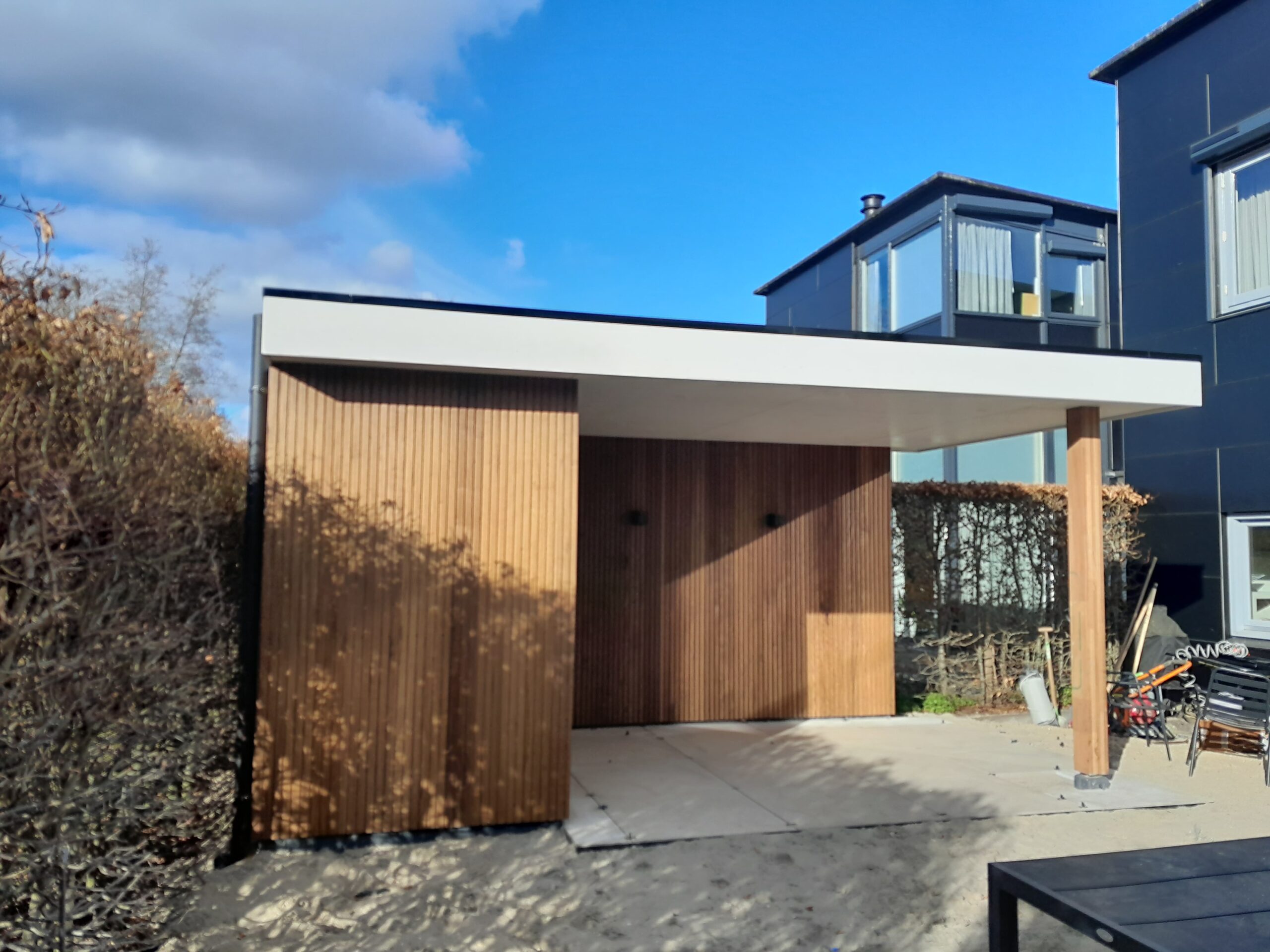 Dit project vormt de basis voor het huidige Deluxe model. De aanvraag van deze klant sloot precies aan bij een idee dat al langer speelde voor een luxer en strakker buitenverblijf. Door dit project concreet uit te werken en te realiseren, zijn ontwerpkeuzes, materiaalgebruik en details verder aangescherpt en vastgelegd. Het resultaat is een overkapping met een hoogwaardige afwerking en een duidelijke scheiding tussen lounge en berging, uitgevoerd als compleet maatwerk en enkel leverbaar inclusief montage.