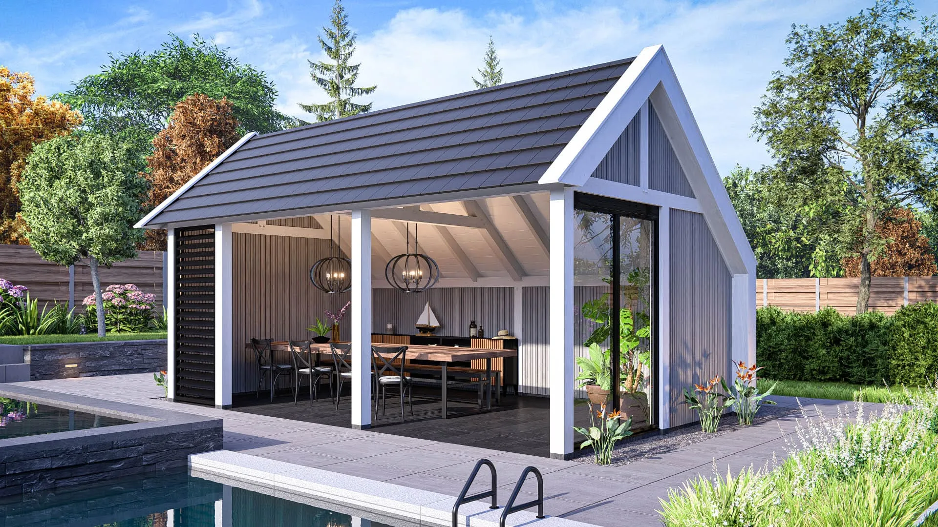 Je past Lissabon eenvoudig aan in afmetingen, wandindeling, kleur en afwerking. Geschikt als overkapping, berging, tuinkamer of een combinatie daarvan. Zo sluit het altijd aan bij jouw tuin en manier van gebruik.